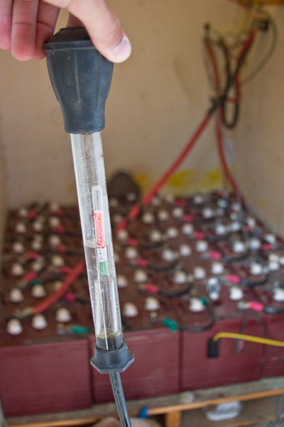One of the joys of living here is learning, out of necessity, things you would never ever need to know in most walks of life. I can now operate an off-grid power system, drive a tractor, run and maintain chainsaws, weed whackers, log splitters, cement mixers... So if your sense of ambition is sparked off by any of the above, come and join us for work practice. Get your hands dirty. By checking the battery electrolyte with a hydrometer (an object uncannily similar to a turkey baster) I find out that the batteries need to receive an equalization charge, part of their monthly maintenance. Basically, this consists of raising the voltage of the 24V system to around 31V via a generator charge, and rapidly boiling the electrolyte in order to get rid of any deposits that have formed on the electrodes. You would not want to be in the battery shed when this was happening, unless boiling sulfuric acid and rapidly forming hydrogen gas in a confined space is your idea of a good time. Once the charge is over (it will take about 12-14 hours in total) I will then have to check each of the 3 cells in all 24 batteries to make sure that not too much liquid boiled away and that the electrodes are still covered in electrolyte. Not one of my favorite jobs. It involves plastic gloves, eye protection, distilled water, baking soda (just in case) and some kind of insulating material to make sure I don't inadvertently create a circuit with my body on any of the terminals. Seventy-two small fiddly plastic caps later and the batteries will once again be happily supplying power, 24 hours a day, 365 days a year, to our small mountain community.