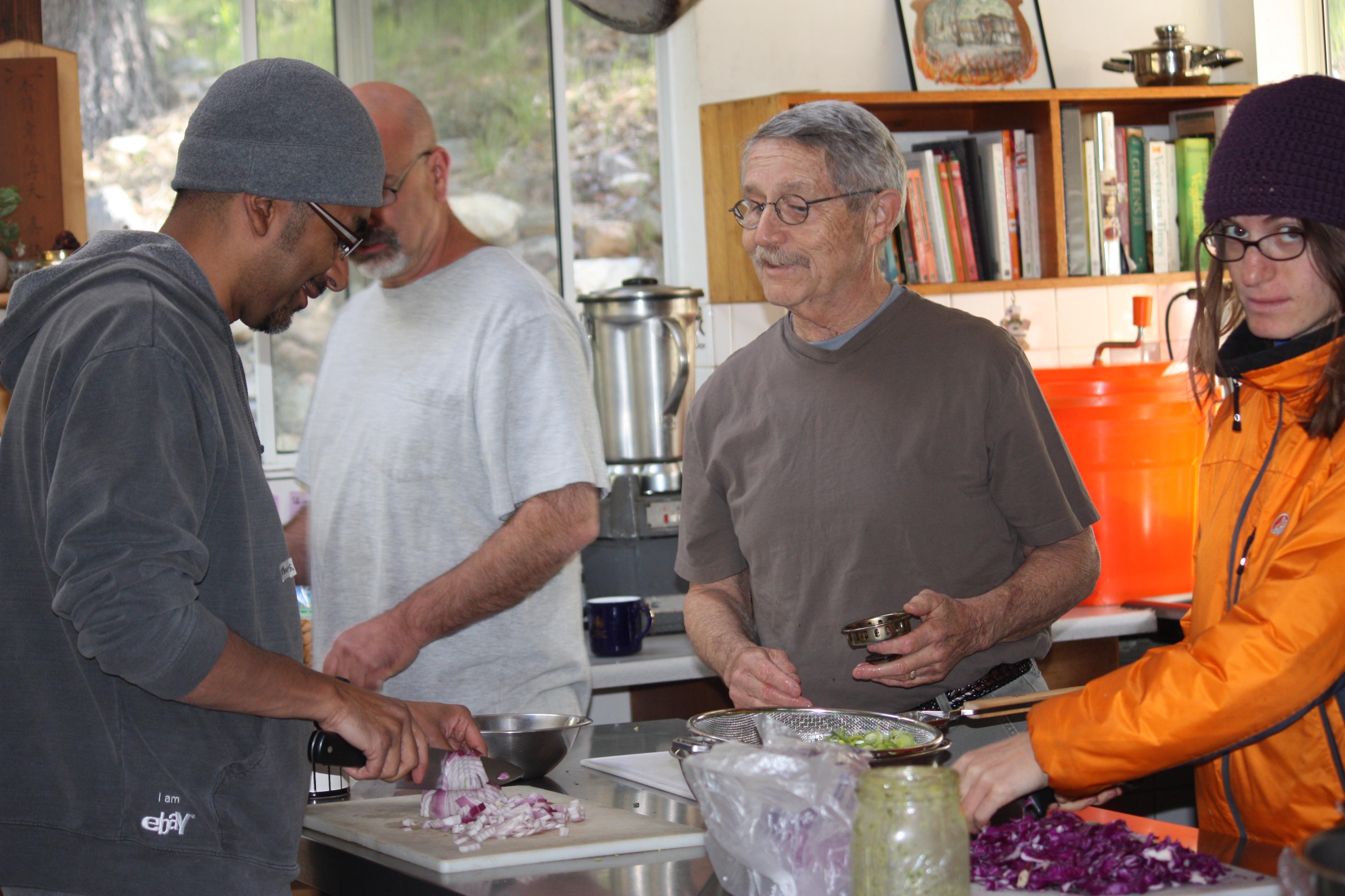 Right now everyone is doing Samu, work practice. Quite a group is working on the rock wall at Roshi's house; of course there is a kitchen crew to help Jonen with cooking; the cleaning crew is busy as usual and Yugen and Graham are in the office.